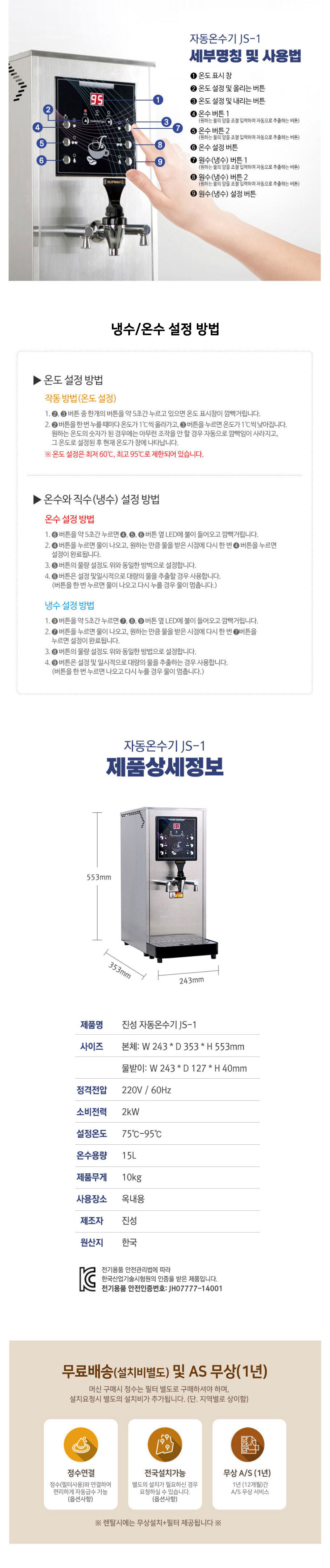 [렌탈] 진성 JS-1 자동 전기온수기 3구 스틸 온수5리터